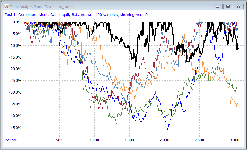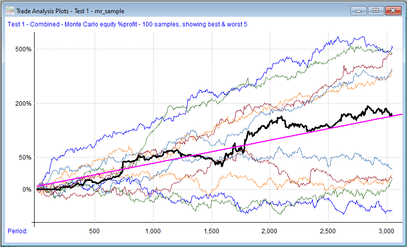 The idea here is to randomly re-order either the individual trades or the daily percent changes in account value many times to see what the possible range of outcome might have been. RealTest uses "random selection with replacement".