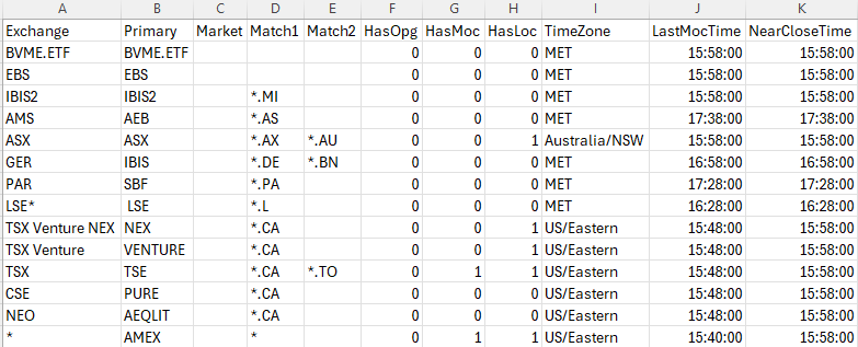2.Exchange matching: If the stock has a non-empty ?Exchange field, the row's Exchange pattern is matched against it. If the stock has no exchange field, the symbol suffix match alone determines the row.