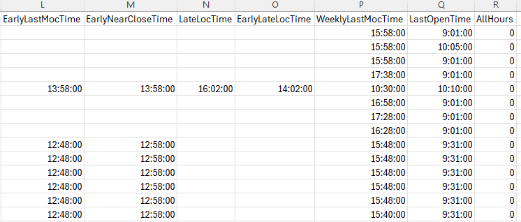 On early-close days (as defined in the HolidayList), the "Early" variants of each time field are used instead: