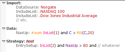 This example could also have used Constituency: $NDX, $DJI and replaced the InList(1) with InNDX and InList(2) with InDJI. Using historical index constituency (requires Norgate Platinum subscription) is recommended for backtests in order to avoid survivorship bias. The InList technique is shown here is only advisable for daily scans or very recent backtests.