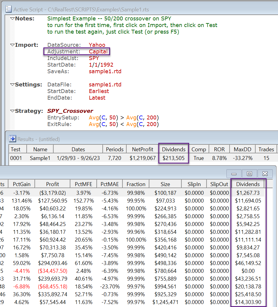 Here is the sample1.rts example script output with the default Adjustment: Capital (splits only):