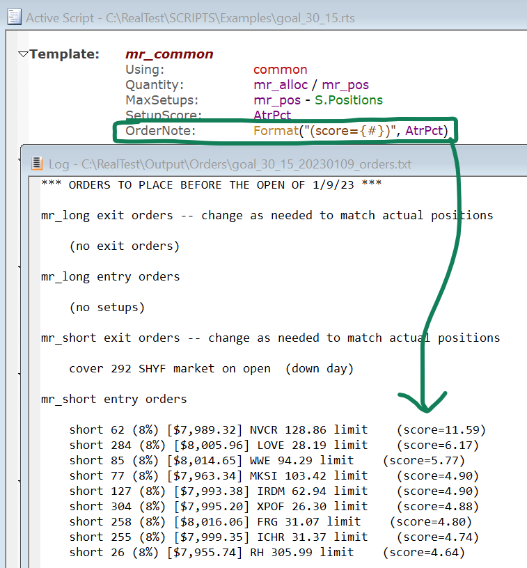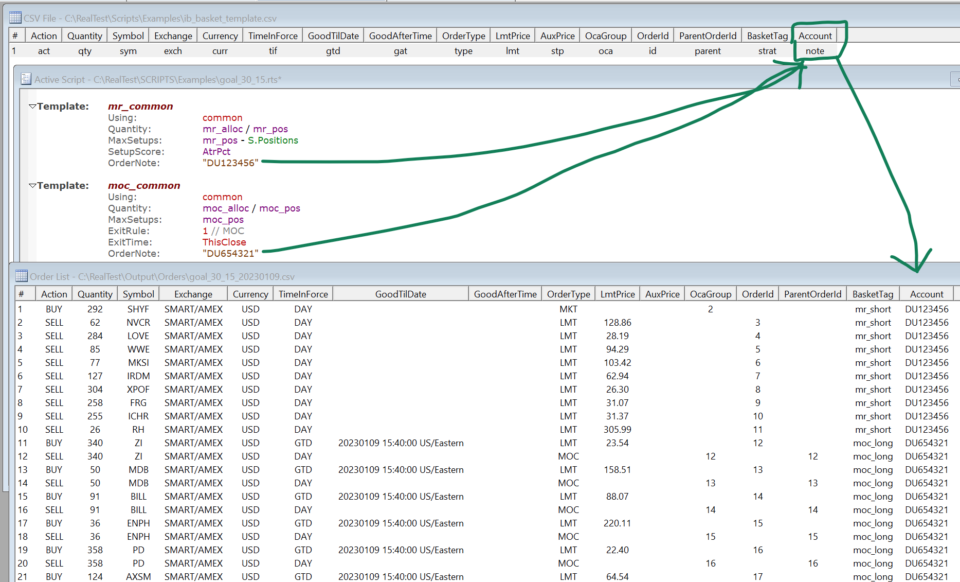 This shows how OrderNote might be used with OrdersTemplate to allow different strategies from the same script to send their orders to different linked IB accounts: