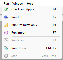 Check and Apply validates the syntax of the active script. If the script contains one or more sections that define window contents (Charts, Graphs, Results, Trades) then it also updates all open windows of those types as specified in the script. Note that it is not necessary to select this item prior to any of the "Run" items -- they all automatically perform the check and apply operation before running.