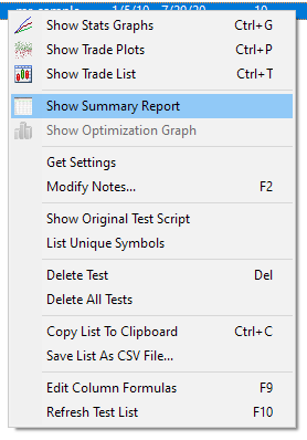 3.Right-click on a test row in a Results Window and select Show Summary Report from the menu: