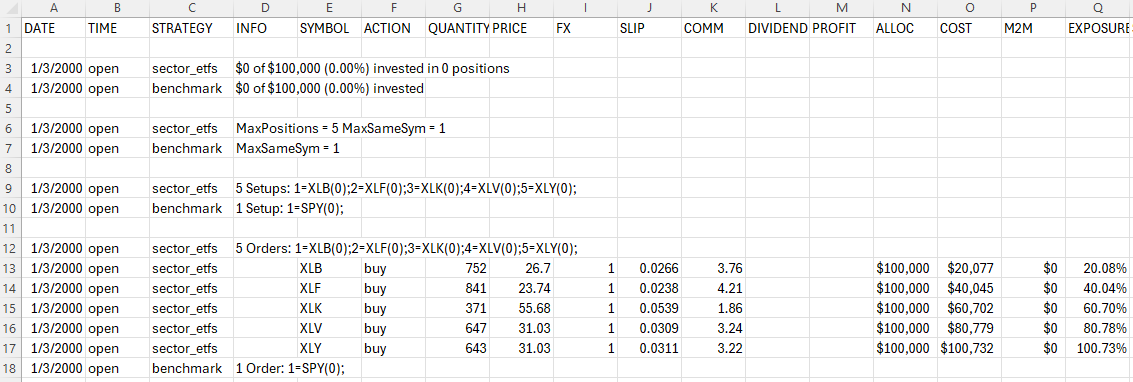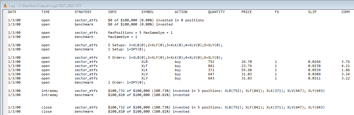 The following is some of the log output for the sector_etfs.rts example script backtest:
