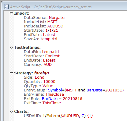 •Add a Currency statement to your Settings, to tell RealTest that you want it to model currency conversion, and what your account's base currency is. No conversions are done if there is no Currency statement.