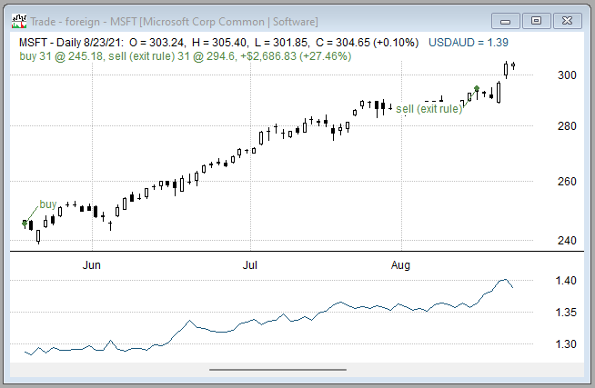 •While the position was held, MSFT paid a divided of $0.56/share for holders of record as of 18-May-2021. This is credited to the trade profit as (31 shares) * (0.56 dividend per share) * (1.2837 USDAUD ratio on the record date) = $22.28 AUD, as shown in the "Div" column of the trade list.