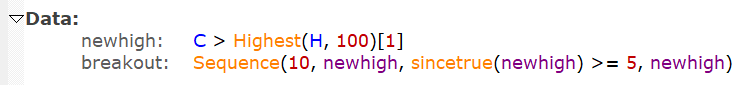 Look for a breakout to a new 100-day high followed by a pullback lasting at least 5 bars followed by another new high, all within the past 10 bars: