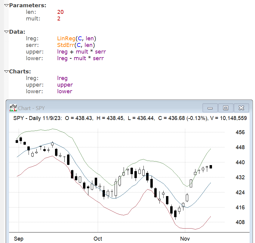 Navigation: Realtest Script Language > Syntax Element Details > StdErr Category Multi-Bar Functions Description Standard error of predicted vs. actual values in a regression Syntax StdErr(expr, {expr2,} count) Parameters expr - data series formula (Y values) expr2 - optional second data series formula (X values -- a linear series from 1 to count is used if omitted) count - lookback period Notes For each value in the expr data series formula, the Slope and YInt are calculated for count values. Each expr value is then compared to the predicted value of that point on the line thus defined. The StdError is the square root of the sum of squared differences between actual expr values and LinReg predictions. This function is equivalent to =STEYX in Excel. Example Example SE20: StdErr(C, 20) Measures how closely price follows a linear trend over 20 bars. Copyright © 2020-2026 Systematic Solutions, LLC