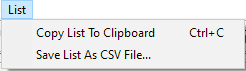 Save List As CSV File prompts for a file path and name, then saves the entire contents of the list to the specified file in comma-delimited text (CSV) format.