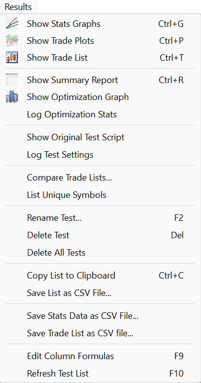 Show Trade List opens a Trade List Window for the selected test.