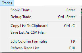 The Trades menu appears in the menu bar whenever a Trade List Window is active, and can also be accessed by pressing the right mouse button within that window.