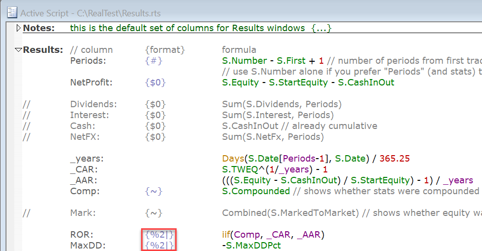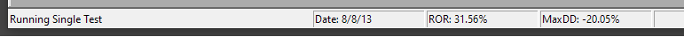 The vertical bar character "|" in the formatting codes indicates that a results item should be displayed dynamically in the status bar while a test is running. By default, the items shown as scripts run are: ROR, MaxDD, Exits, Expectancy, and ProfitFactor.