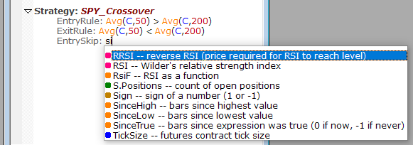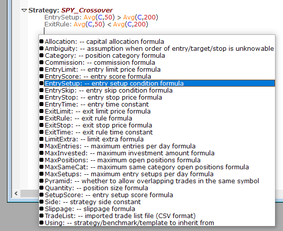 The cursor was indented one tabstop, under "ExitRule" within the Strategy section, so the list shows all available strategy elements.