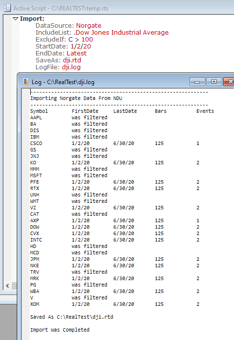 Here is a simple example where the DJIA components were imported but stocks above $100/share were excluded from the import. The log shows which those were.