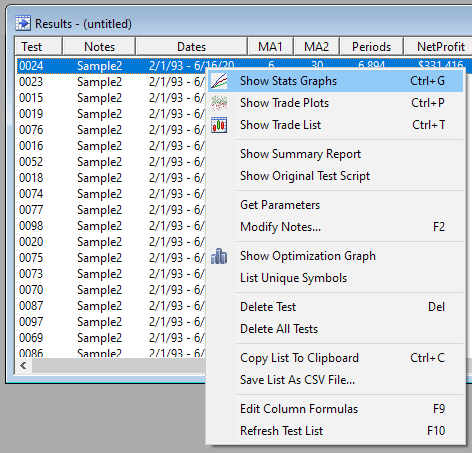 In Results, Scan and Trade list windows you can "drill down" to the detail behind any row by selecting the row and then using the context menu. Double-clicking or pressing the Enter key opens the most commonly used type of detailed data, such as a chart for a trade list or a stats graph for a test.