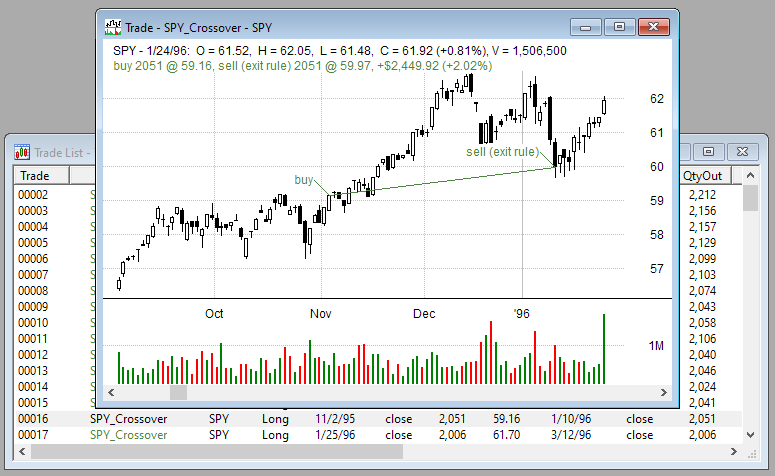 After a graph or chart is opened in this way, it remains linked to the list that it came from. By using the UP and DOWN arrow keys, you can flip through the charts of all trades in a test or symbols in a scan, or the equity curves of all tests in a set of results.