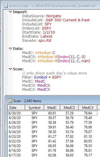 MedC0 filters out non-constituents, but by substituting 0 for their prices, it skews the median value even lower than the the prior column.