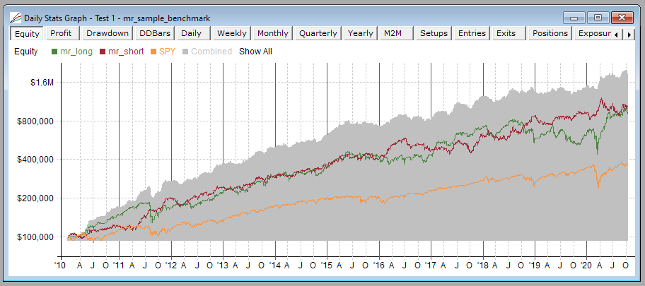 Double-clicking on a row in a results list opens the daily stats graph for that test. Here is an example from a 2-strategy system, long/short mean-reversion:
