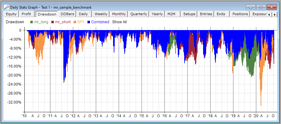 Here is the drawdown graph, showing how the two sides of this long/short strategy will usually hedge each other to some degree:
