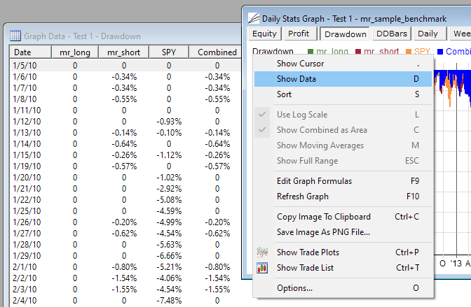 To quickly access the underlying formulas for any Results, Graphs, Trades or Chart window, press the F9 key or use the context menu.