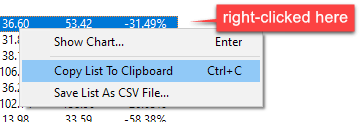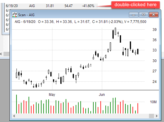 Double-clicking on any row of a Scan Window opens a chart of that stock with the rightmost bar set to the date shown in that row.