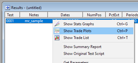 To view a trade plot and access all the trade analysis features, right-click on a test in a Results Window and select Show Trade Plots.