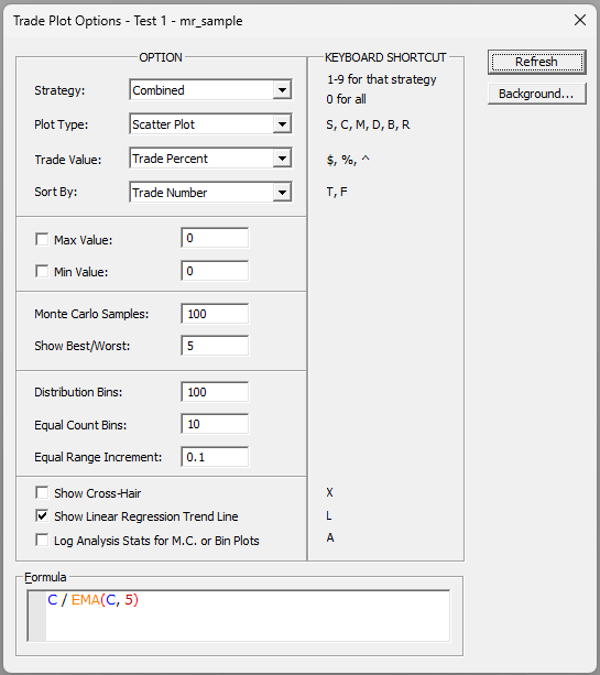Formula is a miniature script editor where you can type any formula expression from the RealTest Script Language. The context of evaluation for the formula is the "setup bar" of each trade, i.e. the latest available bar at the time it was decided to enter the position. This makes it possible quickly sort a trade plot by a variety of "entry factors" to visually assess whether each factor has "an edge". This will be demonstrated below.