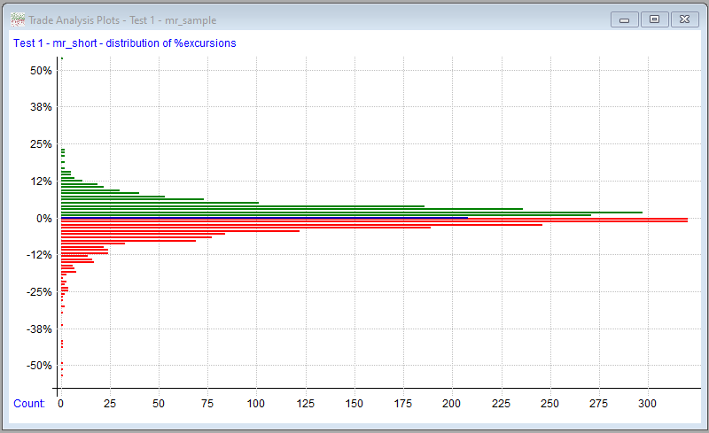 MAE/MFE Distribution is similar to the above, but rather than plotting closed-trade gains, it plots maximum open-position drawdowns and run-ups, also know as "adverse and favorable excursions".