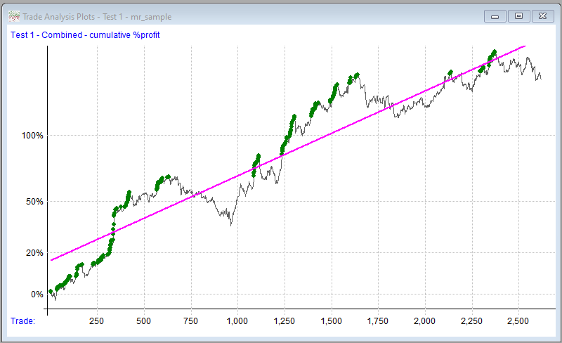 Cumulative Profit is similar to a typical equity curve, but is derived from individual trades rather than daily net change of equity. Green dots show new highs of the profit line.