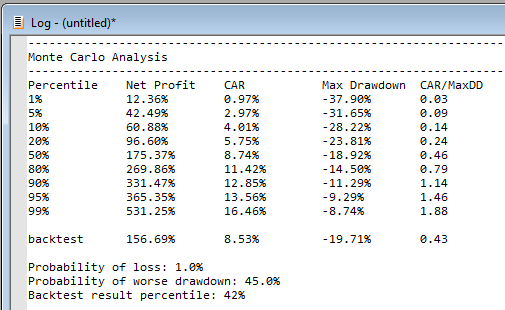 The idea here is to randomly re-order either the individual trades or the daily percent changes in account value many times to see what the possible range of outcome might have been. RealTest uses "random selection with replacement".