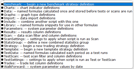 Navigation: Realtest Script Language > Script Sections The outer sections of a script represent different categories of script functionality. To quickly see a list of all available sections, press F2 in a script window with the cursor at the start of a blank line: The following topics describe each script section in more detail. Copyright © 2020-2026 Systematic Solutions, LLC