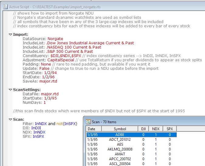 Norgate also provides a unique feature: historical index constituency. RealTest makes it easy to import this information with your data. Use the Constituency element of the import definition to specify one or more indexes that you want constituency data for ($SPX, $DJI, etc.) After the import, that data is available to all formulas as InSPX, InNDX, etc.