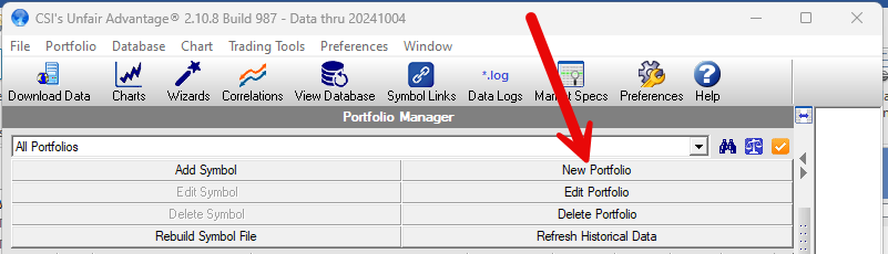 Within the Unfair Advantage program, create one or more new futures portfolios for use with RealTest.