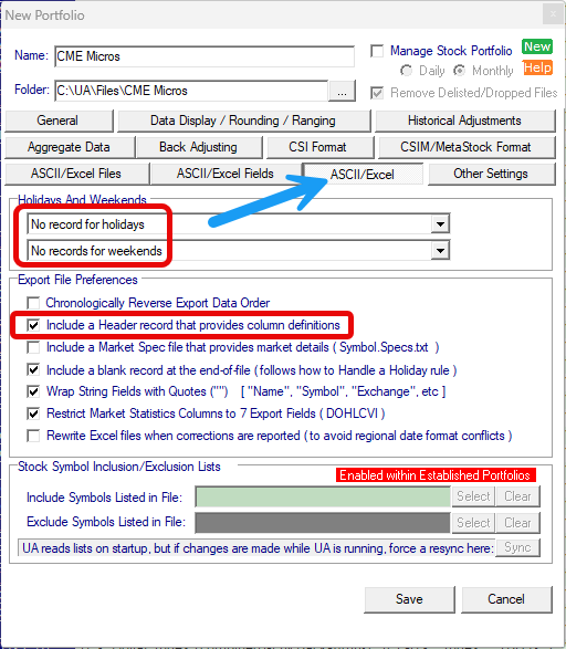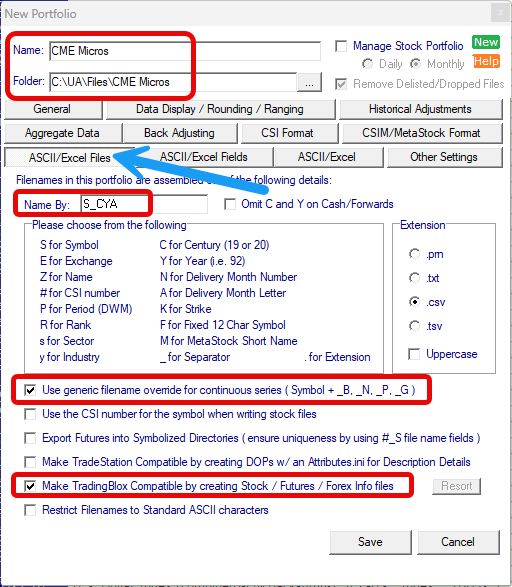 b. the "Make TradingBlox Compatible" box must be checked so that UA will create a "futuresinfo.txt" file