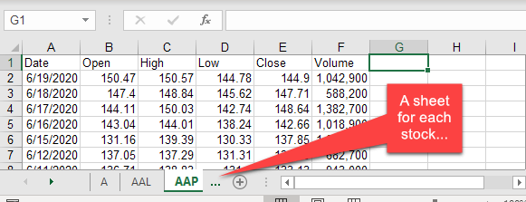 Imagine that data as sitting in RealTest's active memory, like a virtual Excel Workbook, with a separate Worksheet for each symbol, something like this: