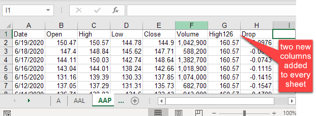 The two new columns, High126 and Drop, have been added to all 500 worksheets in this imaginary workbook, and for each of those worksheets, values have been calculated and stored for (in the tutorial example) all 1,628 rows of each of these two columns in each of these 500 worksheets. That's 1,628,000 calculations that were made and stored.