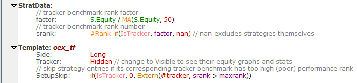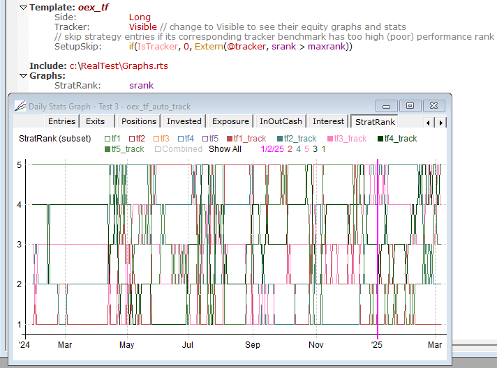 This part of the script implements the auto-tracker mechanism. The script includes five versions of the same trend-following strategy that each use the above template. The "maxrank" parameter loops from 1 to 5 to test how many of the top-ranked strategies to allow new entries for.