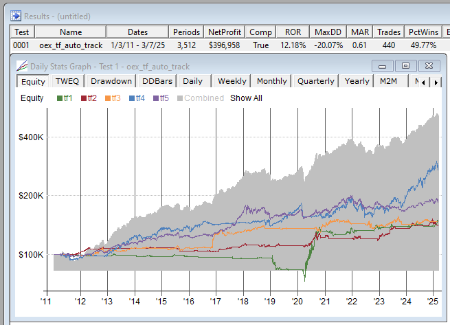 Note that this trades all five strategies, but on any given date will only add new positions in the top two.