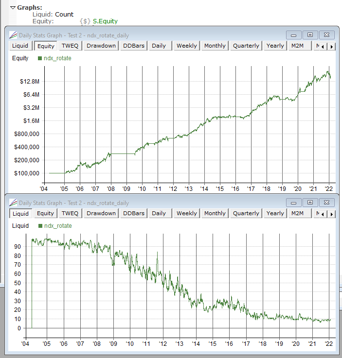 If this script contained other strategies, and you wanted to use only this strategy's equity value for your liquidity constraint, you would need to change the above to Extern(@ndx_rotate, S.Equity).