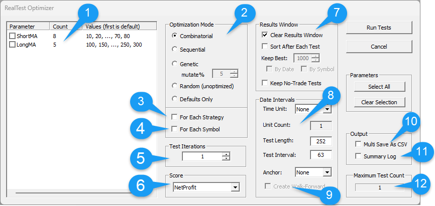 Optimize mode provides typical parameter optimization functionality along with other ways to run multiple tests.